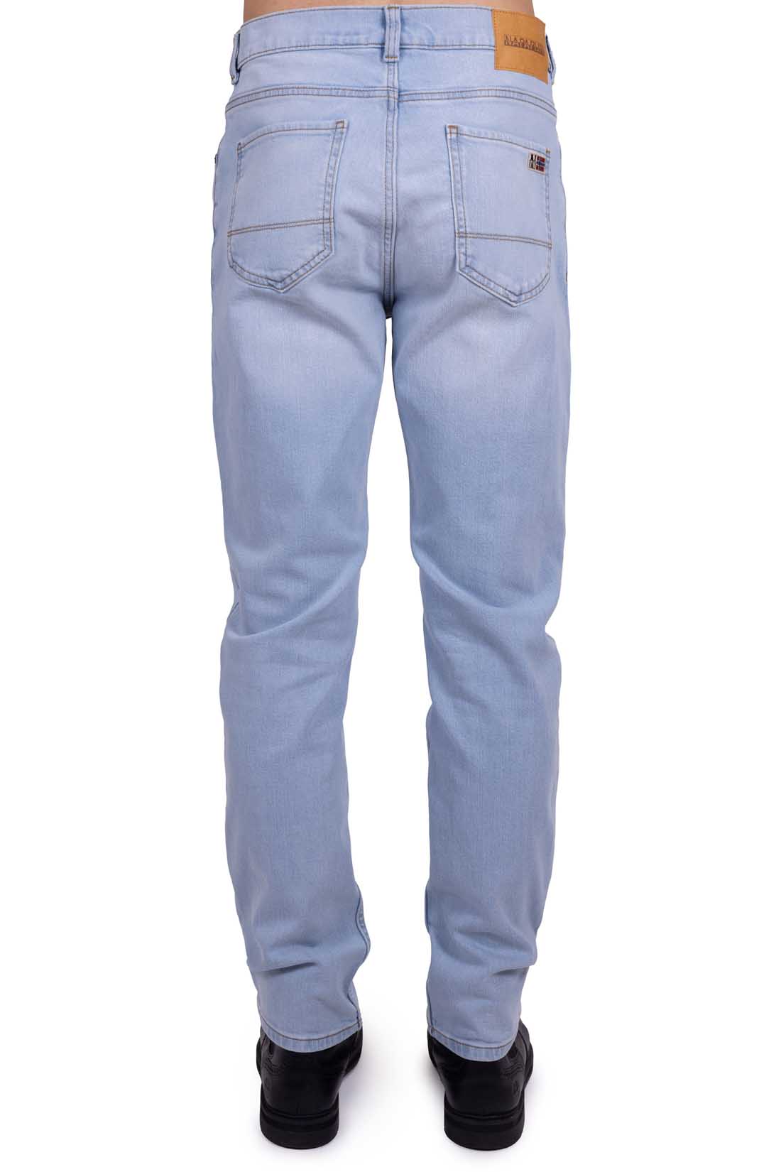 Regular fit men’s jeans in light wash stretch denim, with zip and button fastening, and leather label with Napapijri logo on the back.