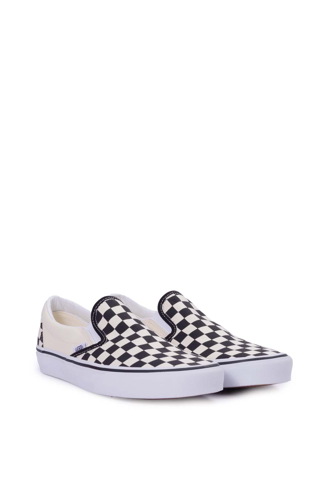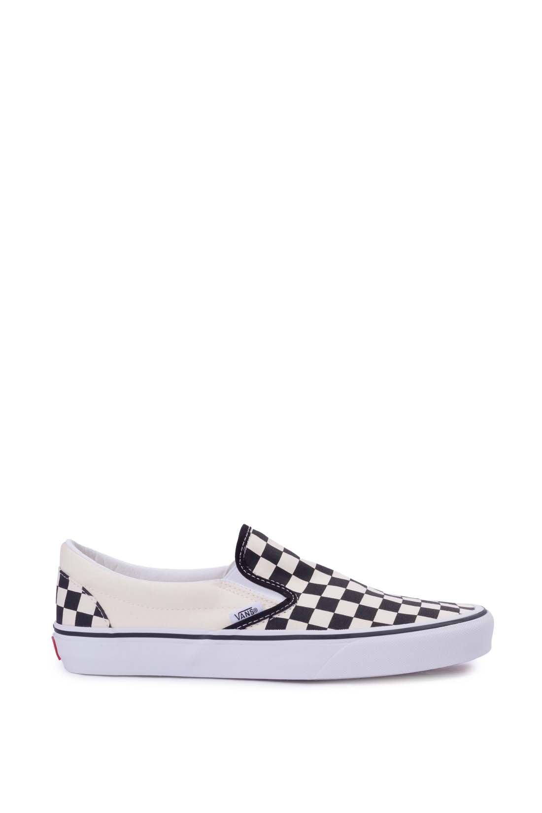 Unisex slip-on sneakers, with canvas upper, iconic Vans checkerboard print, and Vans logo label on the side.